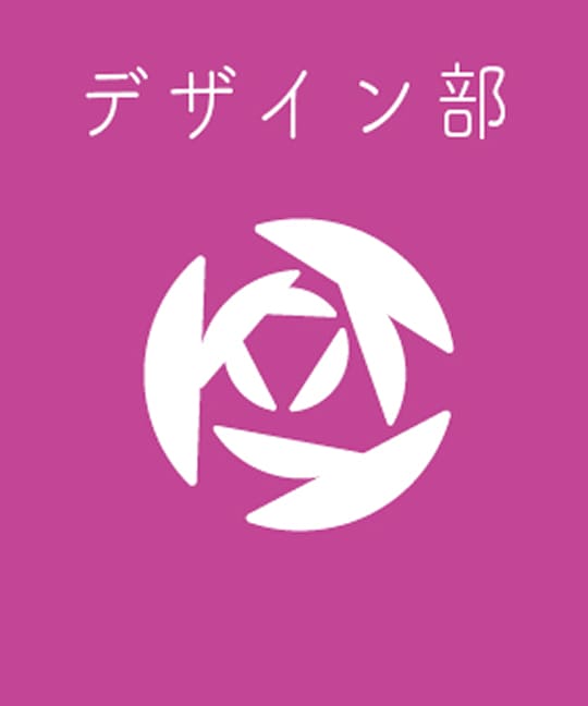 それぞれ運営部(司会進行・運営)はマイク、デザイン部(垂れ幕や飾りの制作)は飾りの花、企画部(お楽しみタイムの企画)はひらめきを表すライトをモチーフにしています。統一感が出るよう、3つとも丸の形を取り入れています。