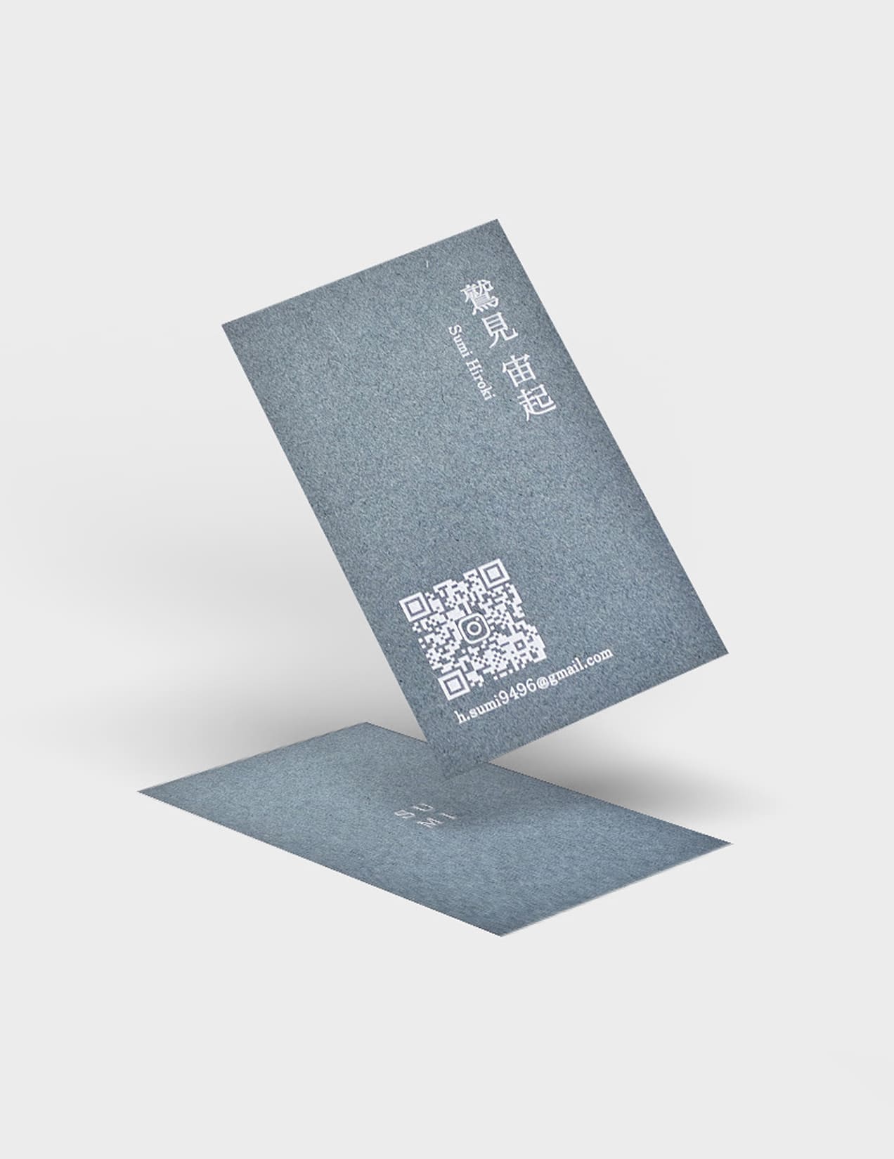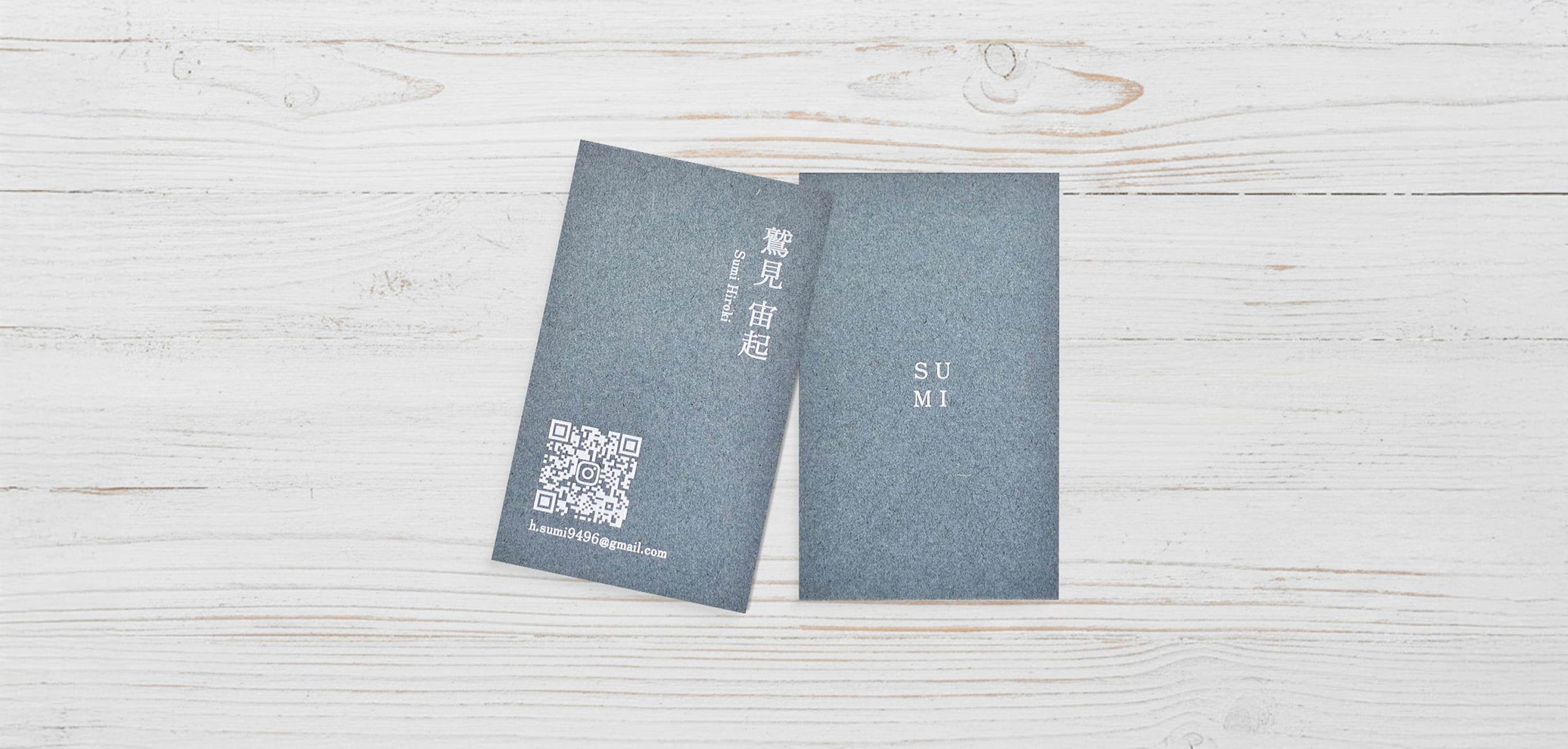 要望の「必要な情報だけをシンプルに見せる」というポイントを大切に、ミニマルで洗練された印象の名刺に仕上げました。表面は情報を厳選して配置することで、余白を活かしたクリアで心地よいレイアウトに。裏面には、名字の「SUMI」を中央に配置し、シンプルさの中にもパーソナルな魅力と印象的なアクセントを加えました。
