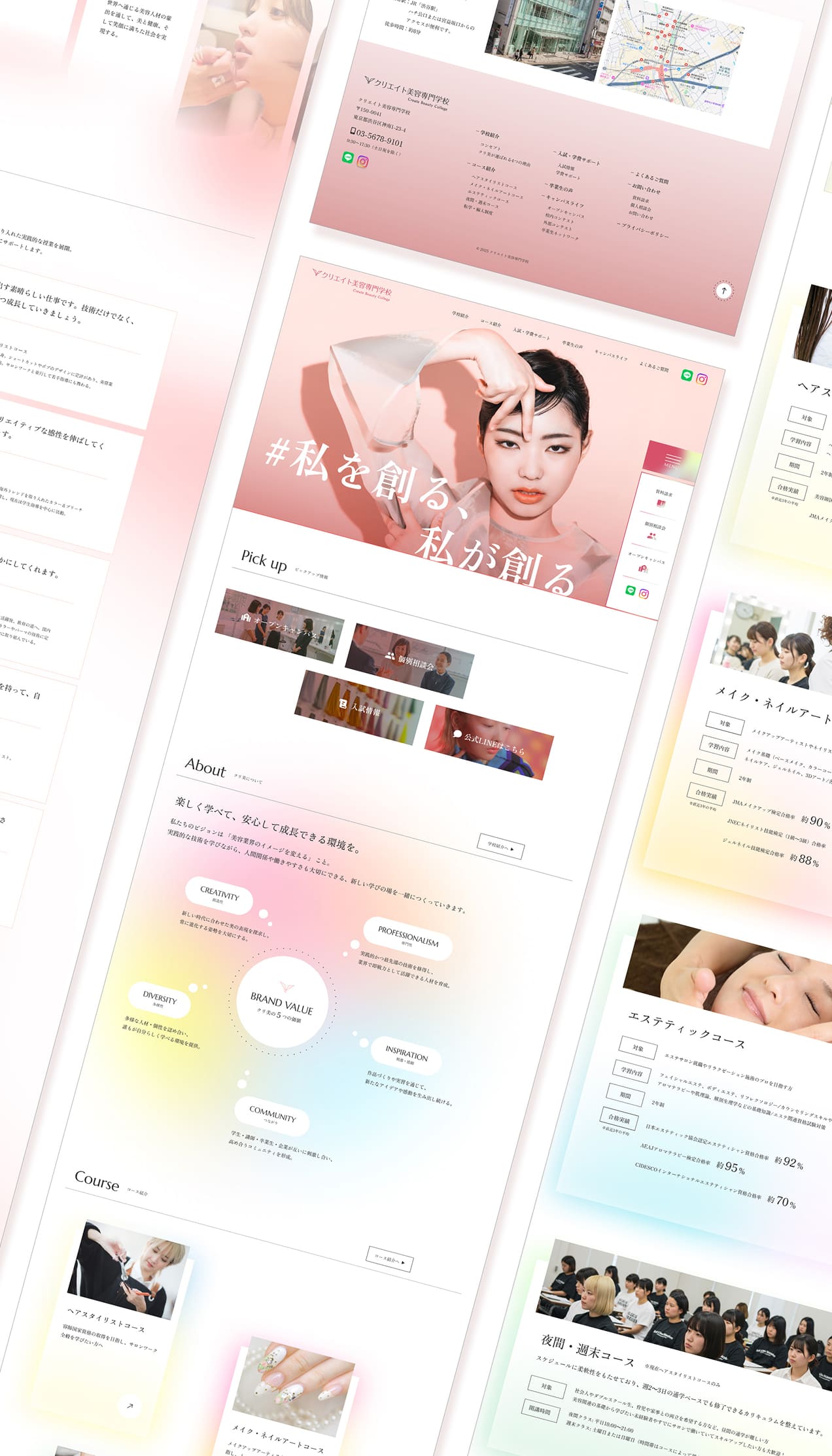 スクールの最終課題として、3人1チームで美容専門学校のWebサイトを制作しました。私はサイト全体のデザインおよび下層ページのコーディングをメインで担当し、トップページのコーディング補助や提案資料の構成・デザインも行いました。