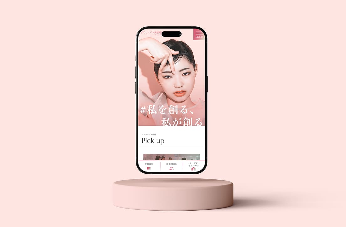 フォントは線に強弱のある大人っぽい印象のものを採用。やわらかさの中にも芯のある雰囲気を表現し、美容専門学校らしい上品な雰囲気を演出しました。