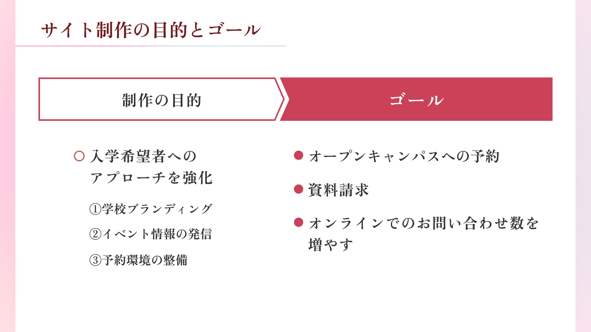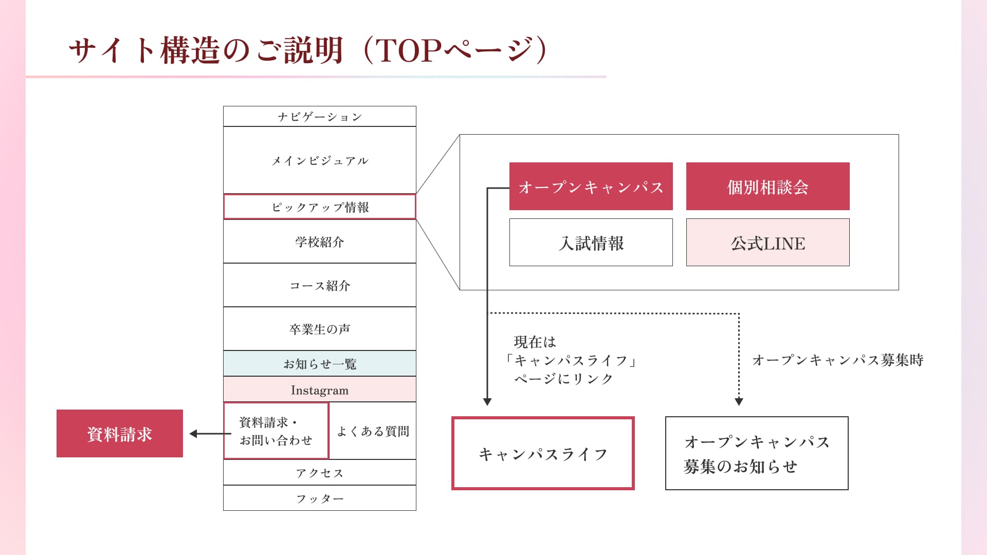 情報量が多い学校サイトという特性を踏まえ、ユーザーが迷わず目的の情報へアクセスできるように、アコーディオンメニューやページ内リンクを活用。情報設計の段階から、ユーザーの導線設計と利便性を重視して構成を工夫しました。
