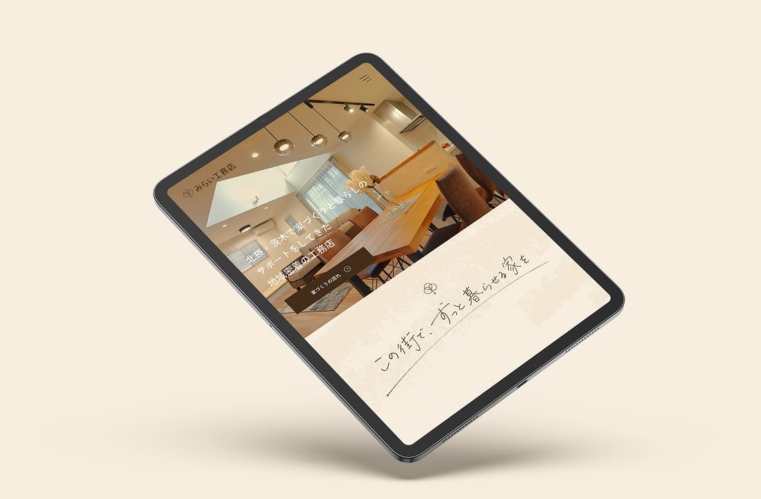 地域密着型の工務店であることから、現場で働くスタッフの写真を多く取り入れ、“顔の見える”安心感を視覚的に伝えています。メインビジュアルの下に手書きのキャッチコピーを用いることで、より温かくフレンドリーな印象にしました。