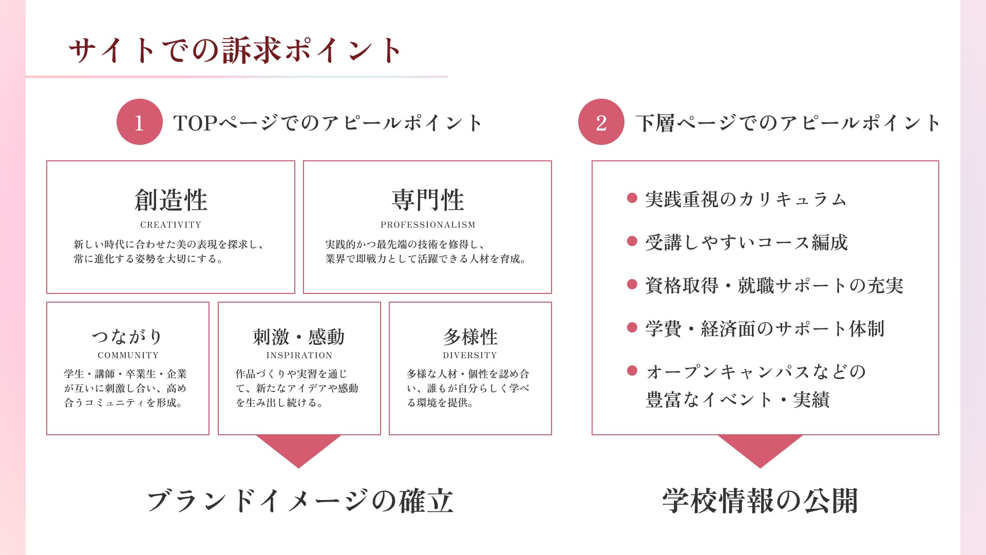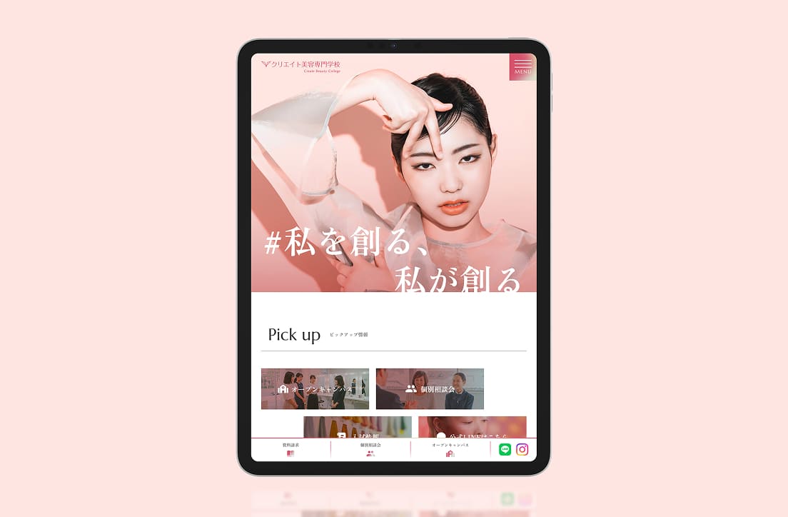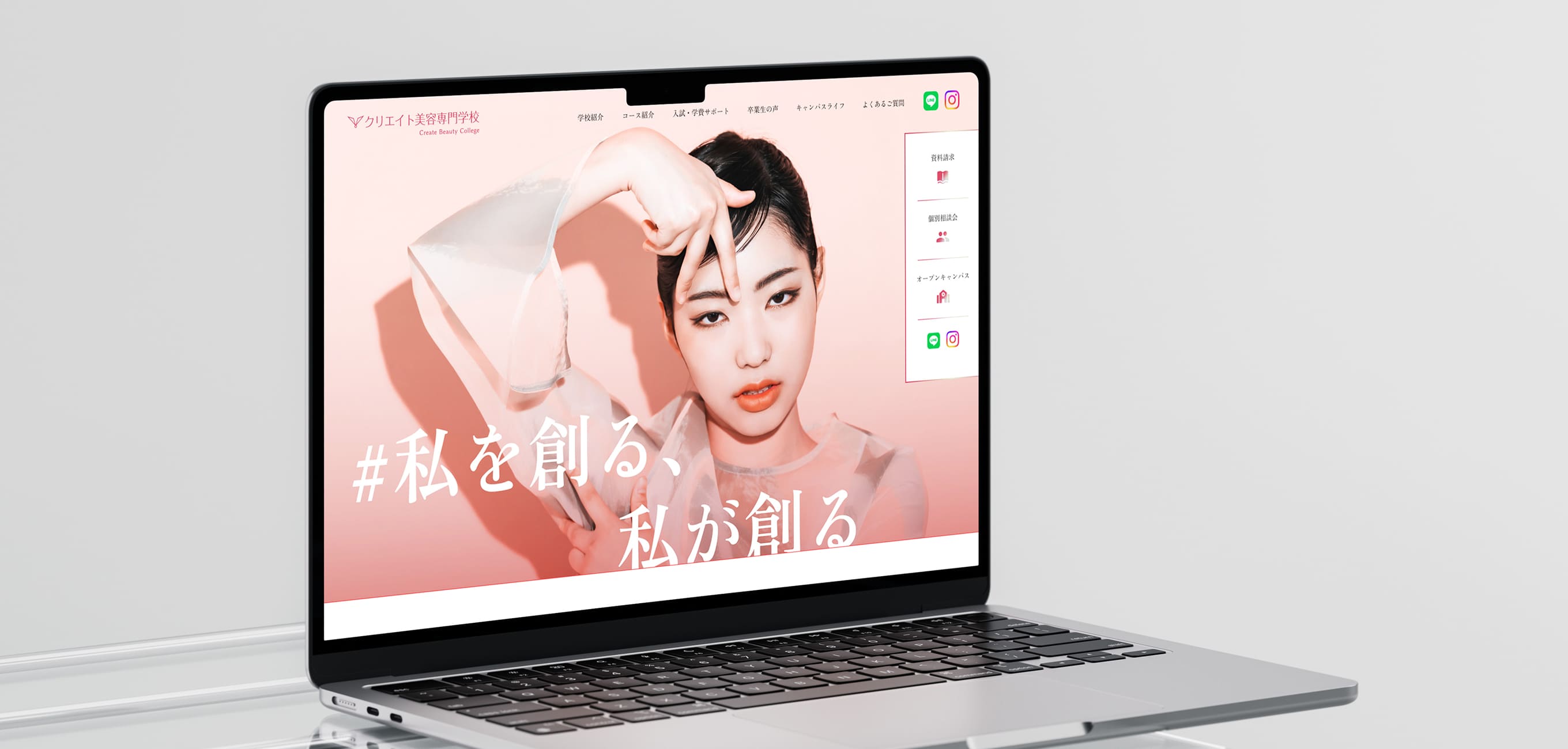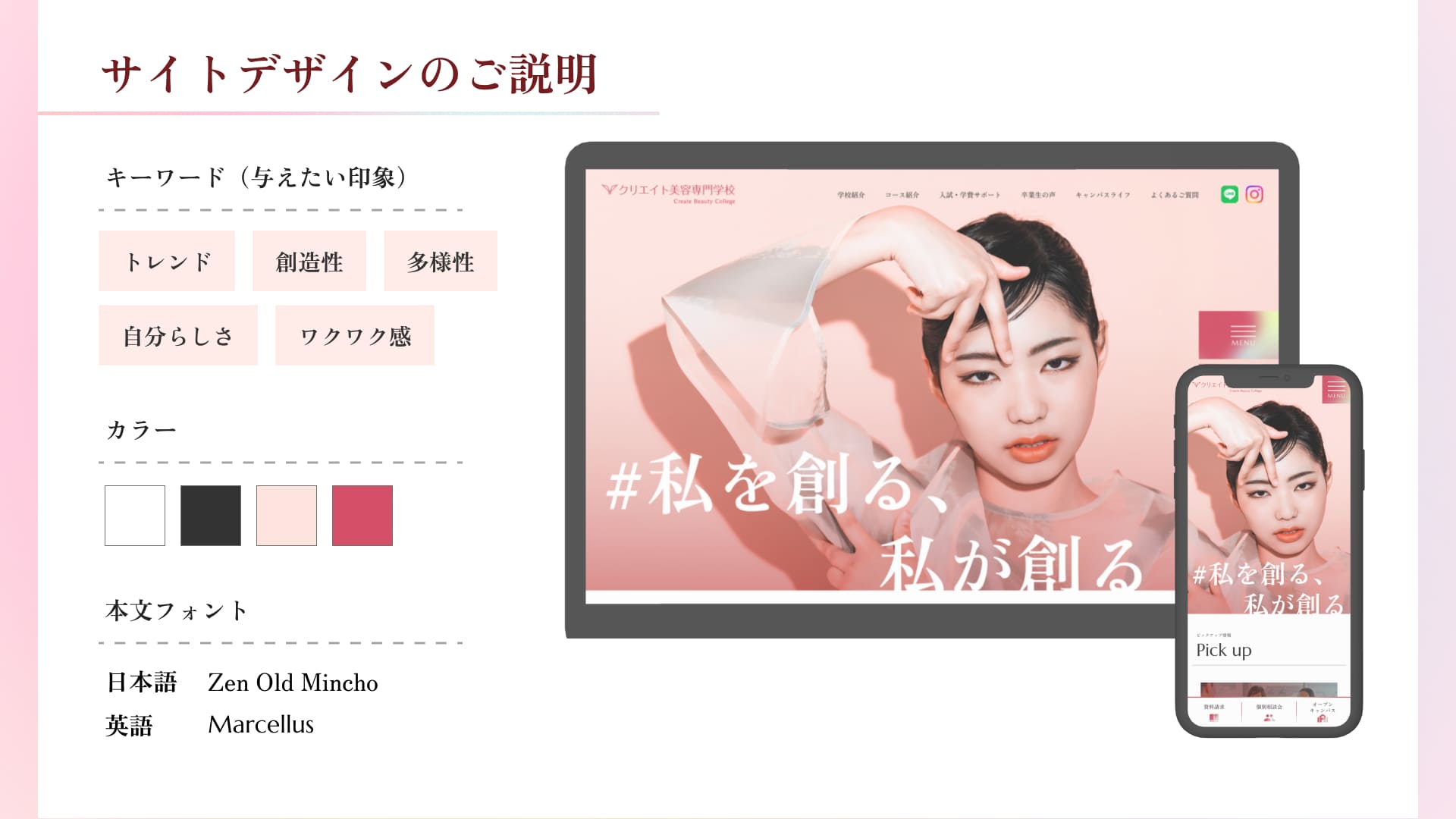 フォントは線に強弱のある大人っぽい印象のものを採用。やわらかさの中にも芯のある雰囲気を表現し、美容専門学校らしい上品な雰囲気を演出しました。