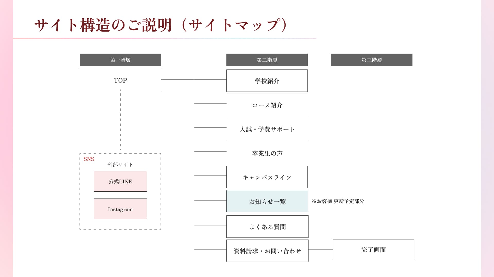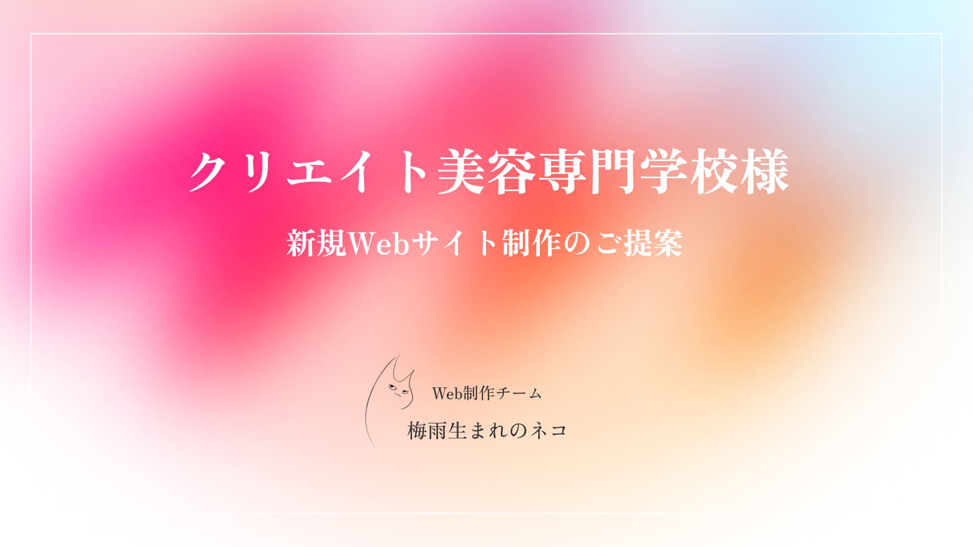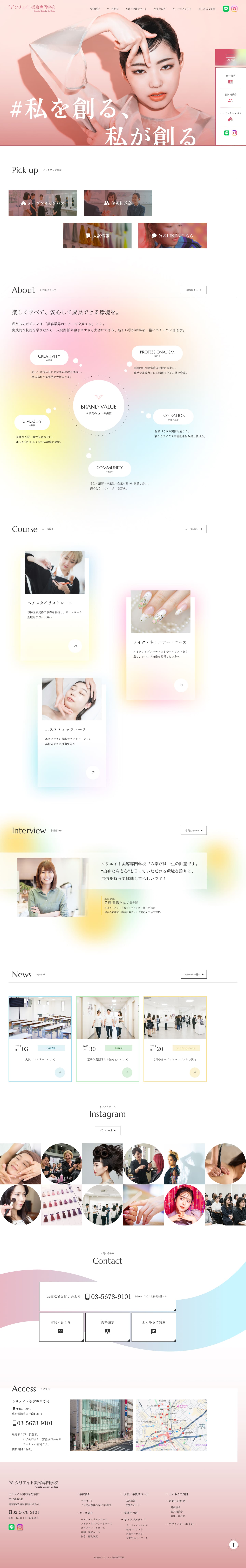 スクールの最終課題として、3人1チームで美容専門学校のWebサイトを制作しました。私はサイト全体のデザインおよび下層ページのコーディングをメインで担当し、トップページのコーディング補助や提案資料の構成・デザインも行いました。