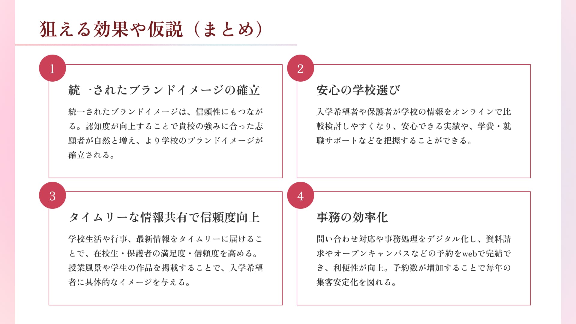 期待できる効果は「統一されたブランドイメージの確立」「安心できる学校選び」「タイムリーな情報共有による信頼度向上」「事務業務の効率化」の4点です。これらが相互に作用することで、学校運営全体の質を高め、持続的な発展を支える基盤になります。期待できる未来像としては、ブランド力と発信力の強化により全国から学生を集められるようになること。さらに、正確でスムーズな情報公開によって在校生や保護者の安心感が高まり、次世代への確かなつながりが生まれます。