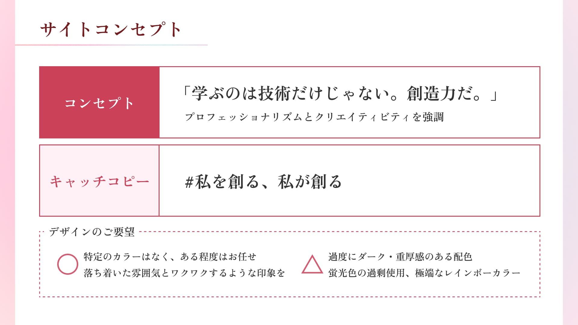 キービジュアルとの統一感を意識し、白・黒・ベビーピンクを基調としたカラー設計を行いました。ターゲット層は10代後半〜30代と比較的若年層のため、アクセントにはフレッシュで力強い濃いピンクを使用し、視覚的なリズムとともに印象に残る配色にしました。