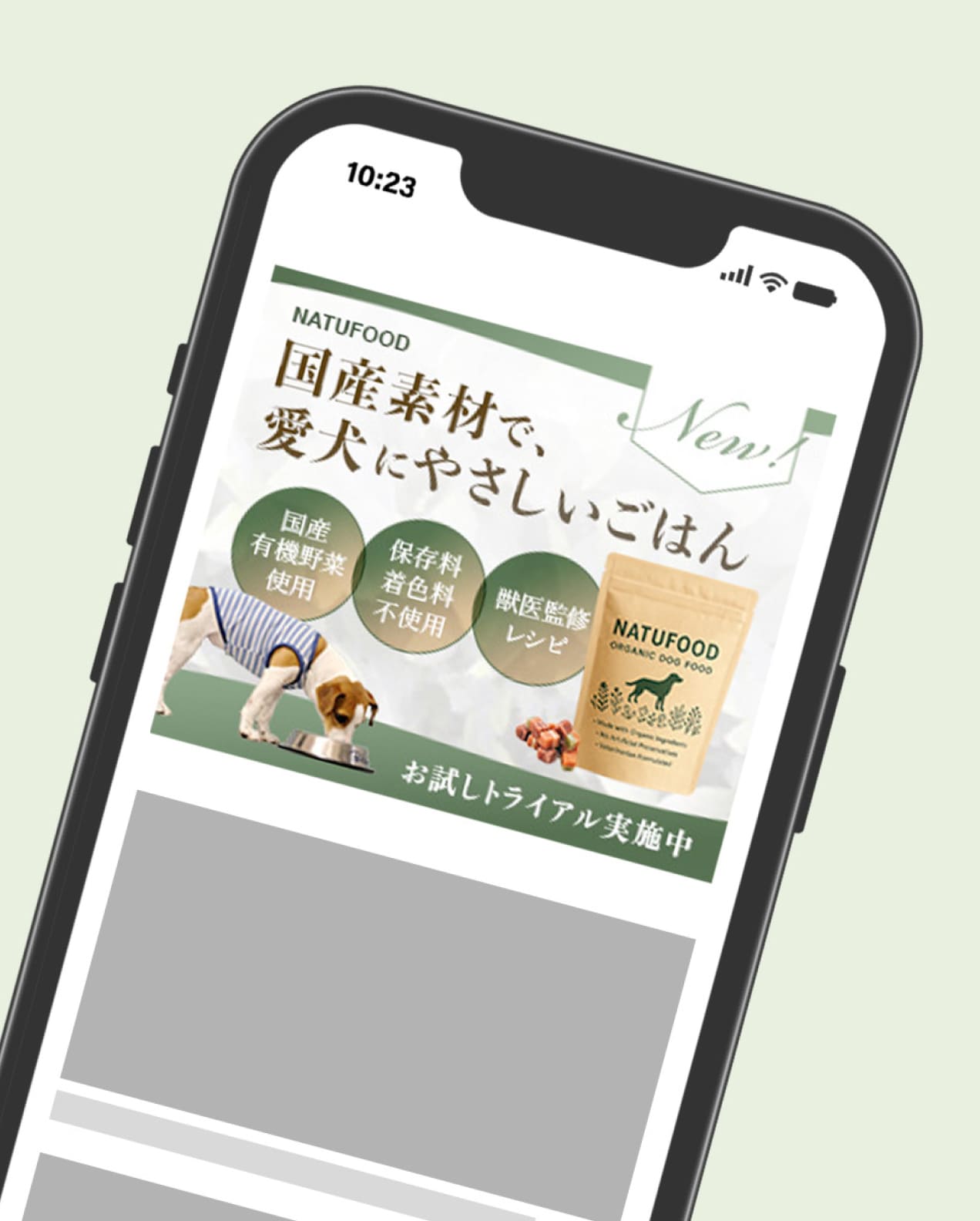 キャッチコピーの「やさしいごはん」や、「国産有機野菜」「保存料・着色料不使用」といった訴求ポイントから、健康志向で自然派なイメージを伝えるために、グリーンを基調とした配色にしました。安心感ややさしさを感じられるよう、トーンは柔らかくナチュラルにまとめています。