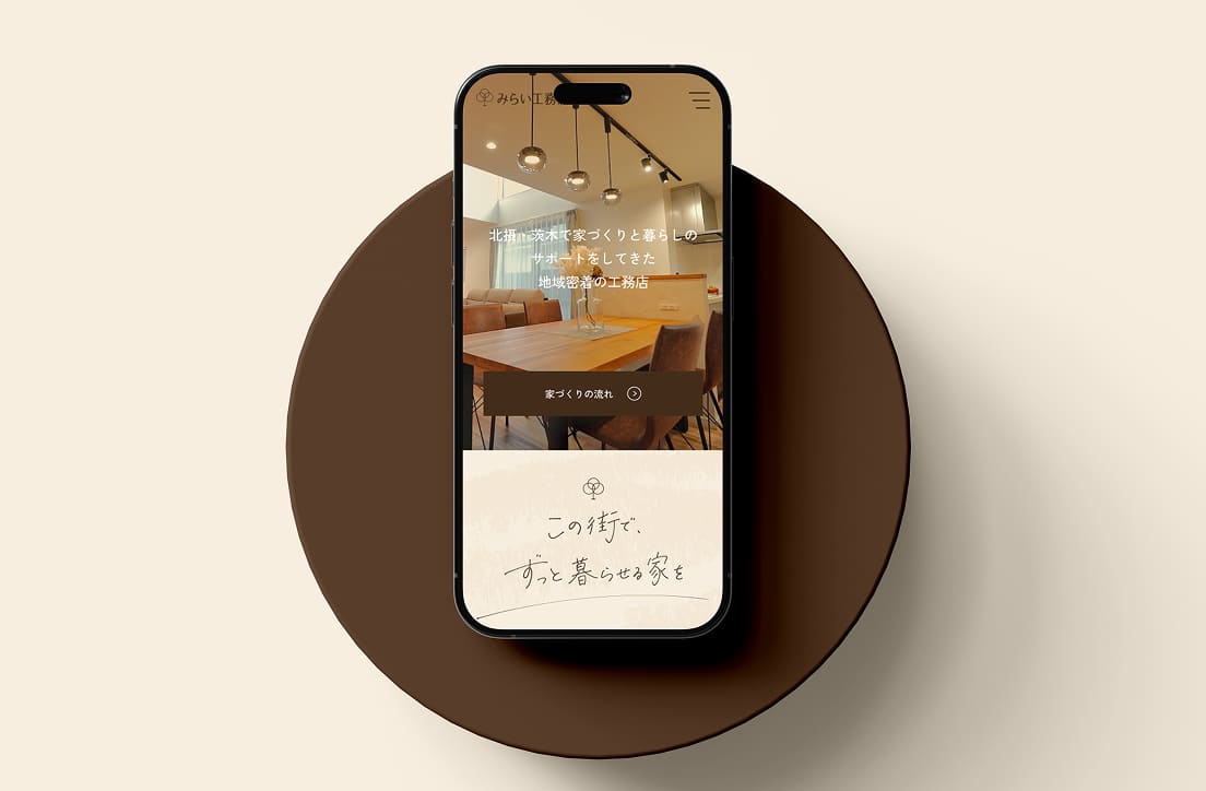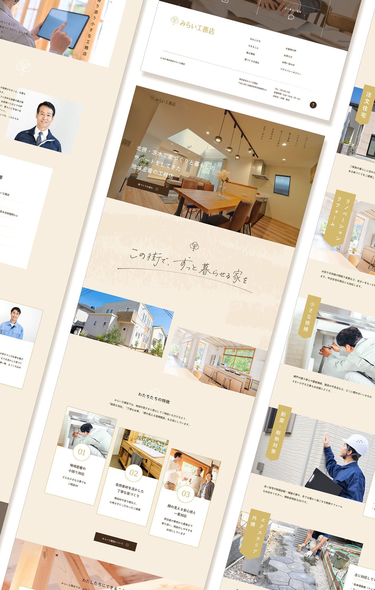 地域密着型の工務店であることから、現場で働くスタッフの写真を多く取り入れ、“顔の見える”安心感を視覚的に伝えています。メインビジュアルの下に手書きのキャッチコピーを用いることで、より温かくフレンドリーな印象にしました。