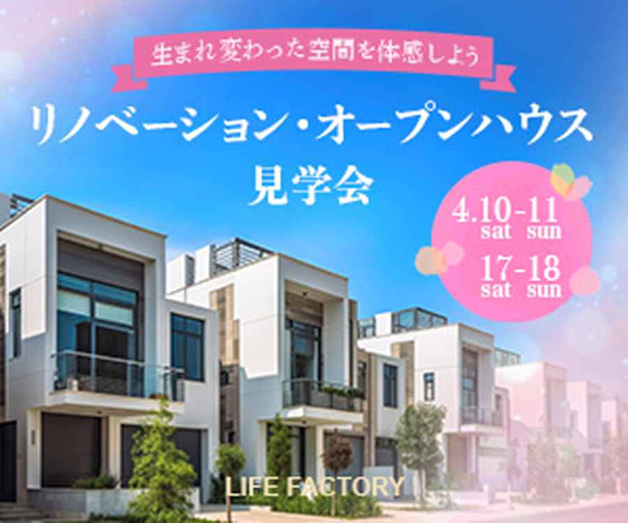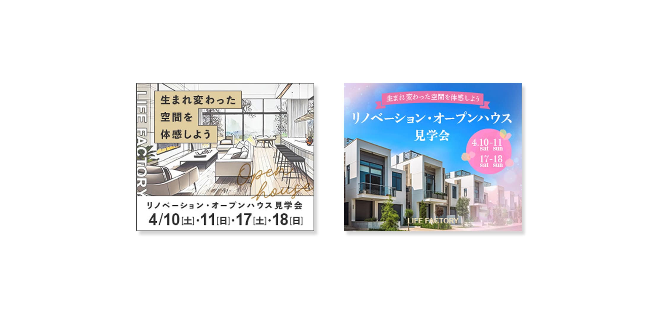 架空のリノベーション・オープンハウス見学会のバナーを制作しました。写真の雰囲気を活かしたデザインと季節感を意識したデザインの2案提案しました。