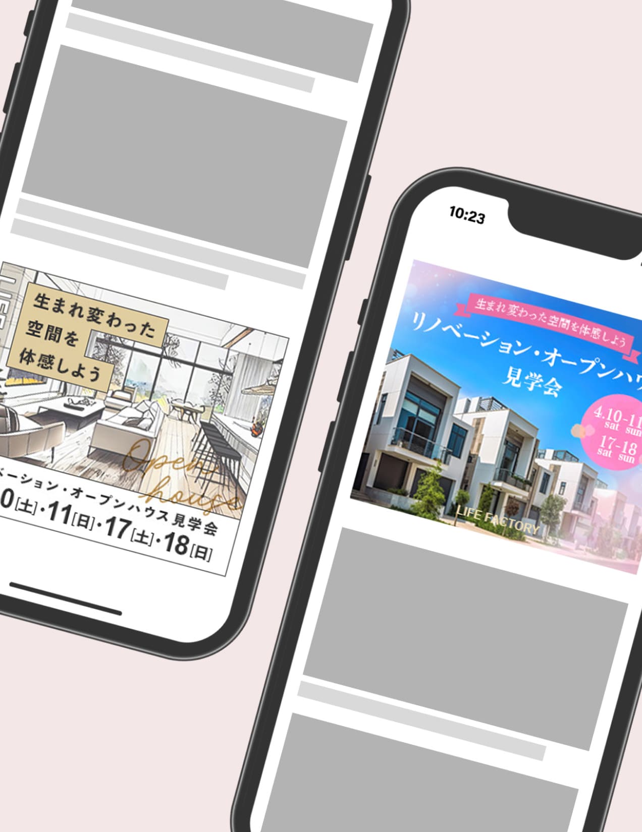 見学会の日程に合わせて、春らしいイメージになるよう設計しました。やさしく柔らかい印象を与えるピンクに、明るいブルーを組み合わせることで、爽やかさと季節感のある配色に仕上げています。